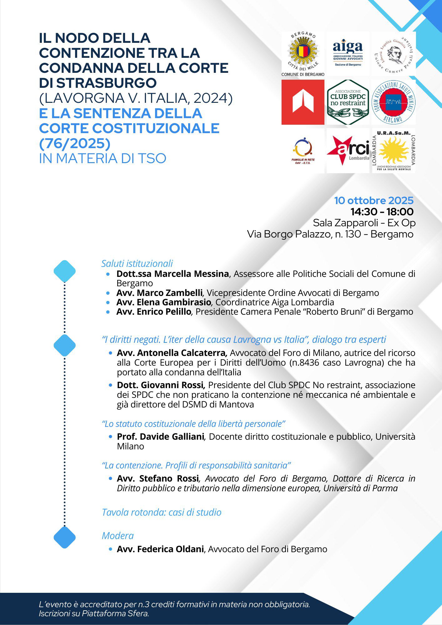 Famiglie in Rete, U.R.A.Sa.M. Lombardia e AIGA - Associazione Italiana Giovani Avvocati (sezione di Bergamo e Coordinamento Regione Lombardia), in collaborazione con CLUB SPDC no restraint ed altri, sono onorate di presentare un incontro formativo dedicato al nodo della contenzione.
